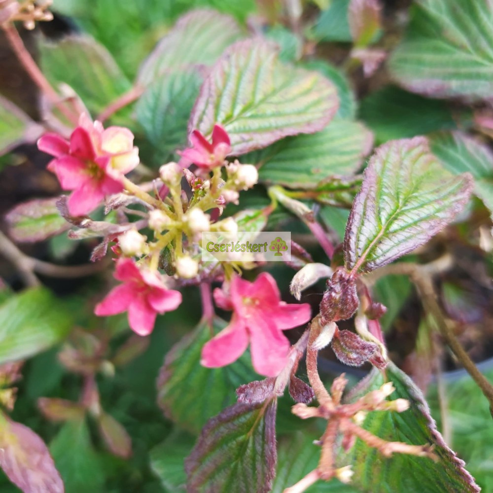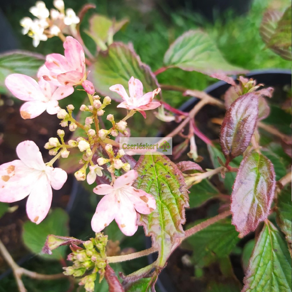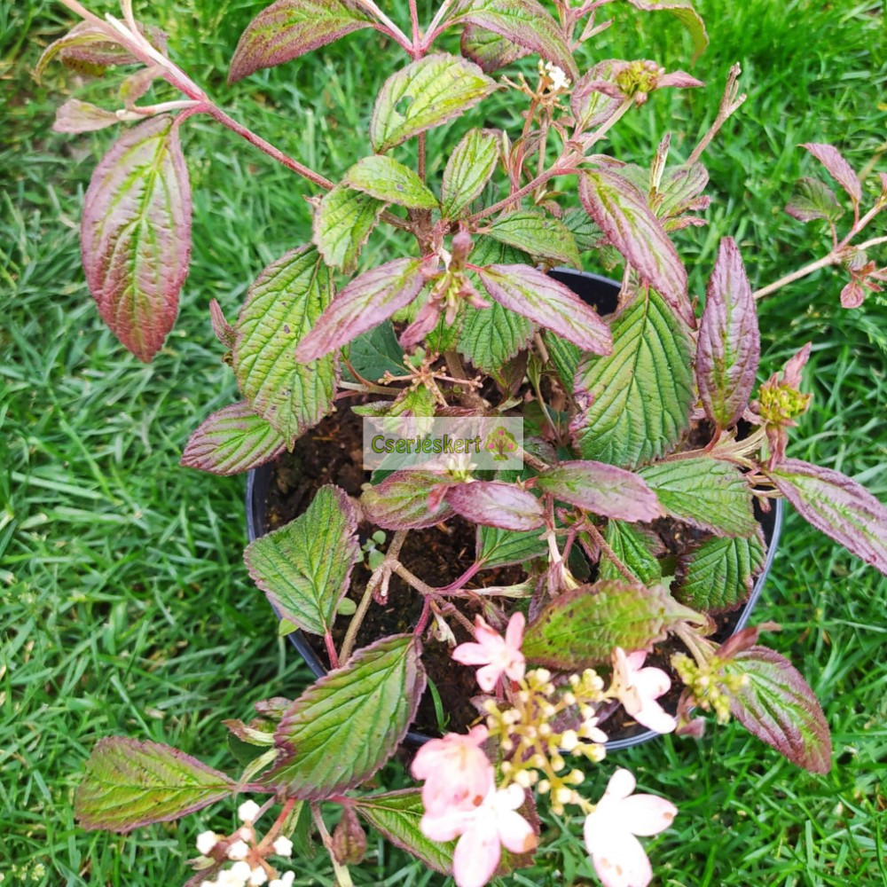 Alig 80-100 cm magasra nő, tulajdonságaiban megőrzi az "unokatestvérei" erényeit, csak kis méretű. Májustól akár szeptemberig virágzik. Lapos formájú virágzások tömegét hozza, kezdetben pirosas színűek, később fehér színűek és rózsaszínnel átmosottak. Alacsony gondozású igényű és vonzó egész évben, főként kisebb méretű kertekbe, teraszos edényekbe való. Ez a Viburnum élvezni fogja a félárnyékot a tűző napra ne ültessük, csak ha megfelelő vízellátása van.