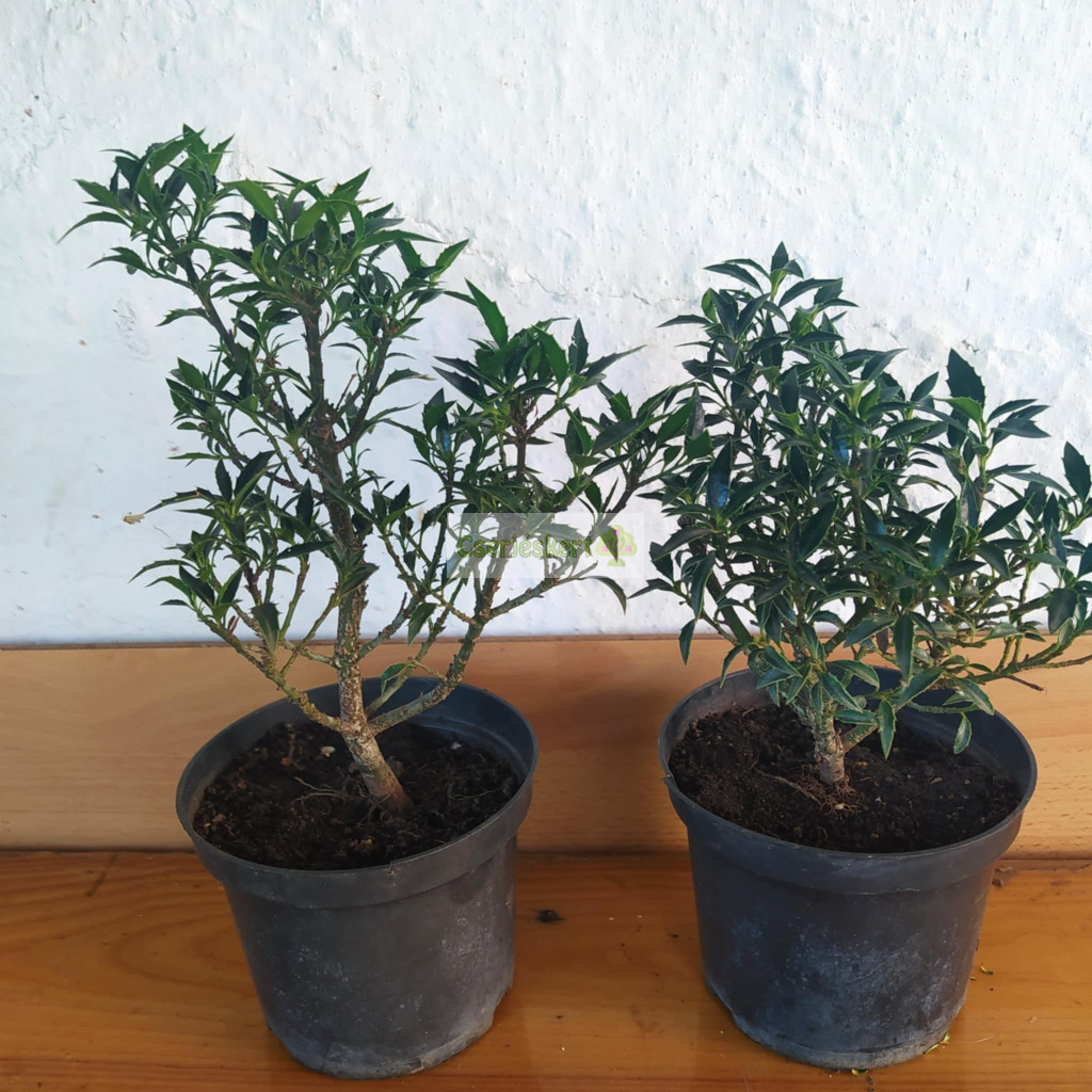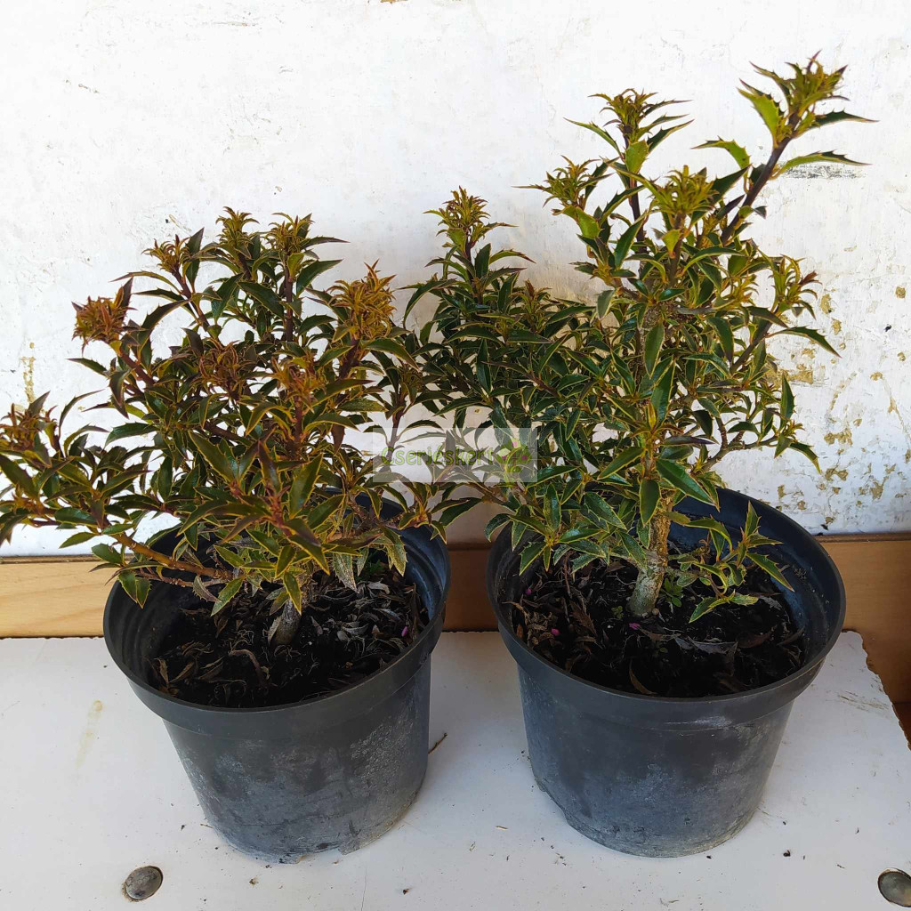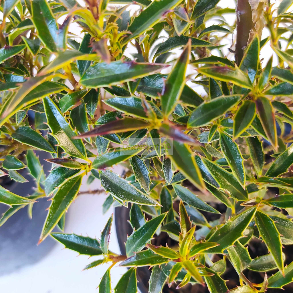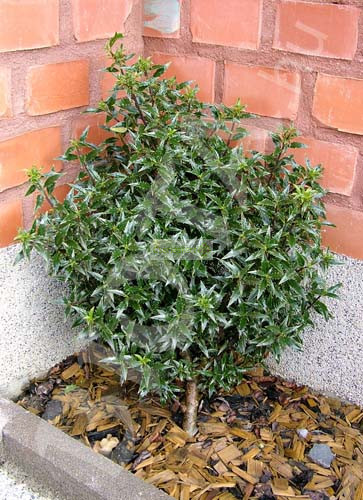 Végleges magassága 2-3 m, de lassan, 10-20 év alatt éri el. Karcsú kúp alakú, oszlopos megjelenésű örökzöld cserje vagy kis fa. Mélylila szárral, keskeny hegyeszöld, tüskékkel szegélyezett levelekkel. Nyár elején fehér virágokkal. Jól tűri a világos árnyékot, szárazságtűrő.