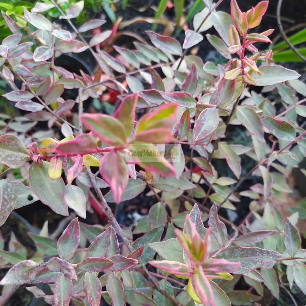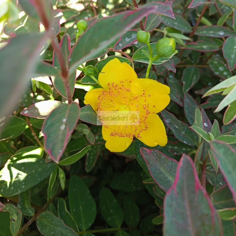50-100 cm magasságot elérő, félörökzöld, kompakt növekedésű cserje. Hosszúporzós, sárga virágai egész nyáron át virítanak. Levelei tarkák: zöld, vajszínű és rózsaszín. Fényes piros bogyó termése van. Érdekessége, hogy a nyár derekán a növényt egyszerre borítja be a virág és a bogyók sokasága. Alacsony termete és bokrosodó növekedése miatt talajtakaró növényként is napos, félárnyékos helyre ültessük. Árnyékban kevésbé lesz dús. Talajok közül a jó vízáteresztő, üde talajokat kedveli. Fagytűrő növény, de hidegebb teleken visszafagyhat, ilyenkor azonban tavasszal újra kihajt.